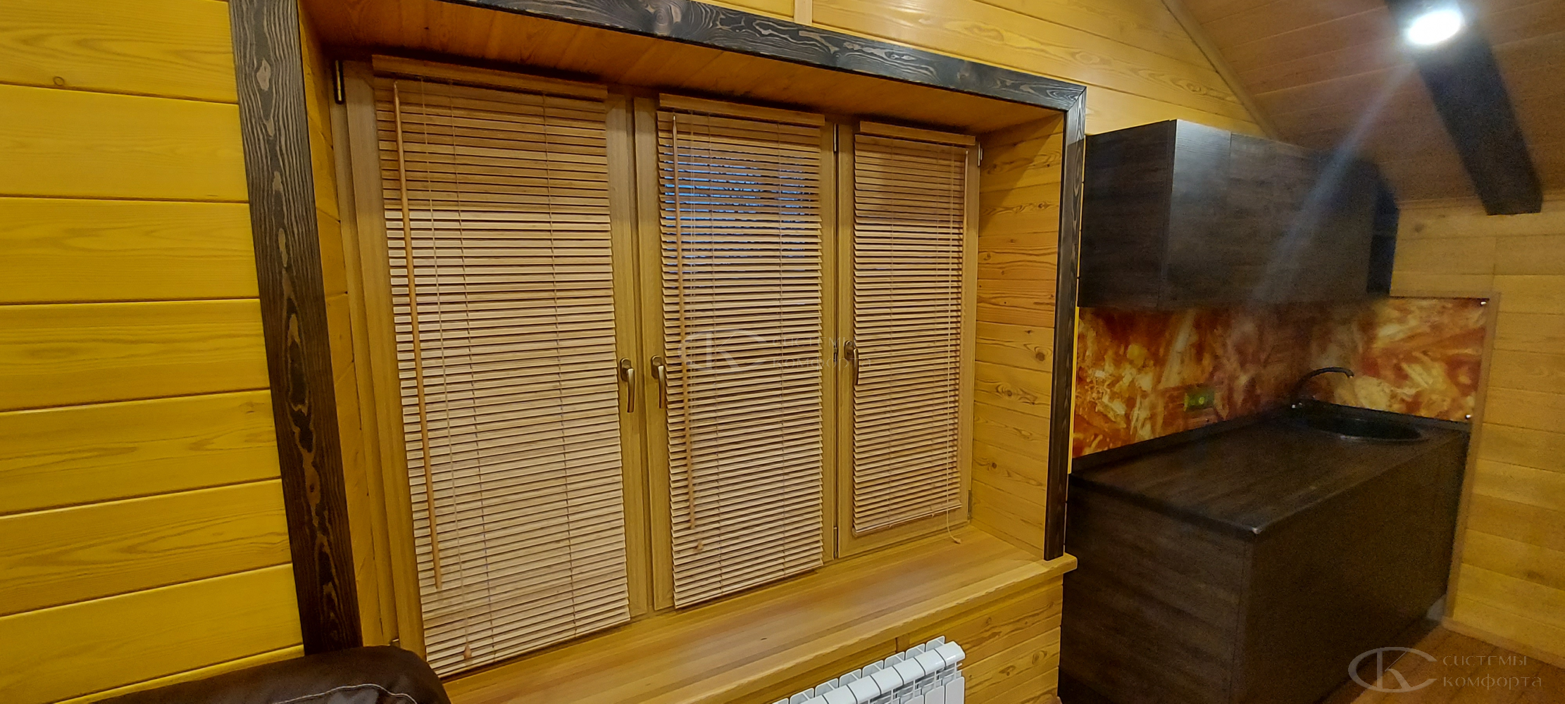 - Алюминиевые ламели. Самый популярный и практичный вариант для дома. Они невероятно легкие, не деформируются со временем, не выгорают на солнце и представлены в сотнях оттенков – от глянцевых белых и серых до имитации дерева (под дерево). Идеальны для кухни, где важна устойчивость к перепадам температуры и влаги, для мансардных окон, где нужна легкость конструкции, и для пластиковых окон в технических помещениях.