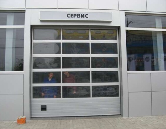 На панорамные ворота, как и на обычные секционные, дополнительно можно установить калитку из аналогичного материала. Это удобно для автомоек, автосалонов или магазинов.